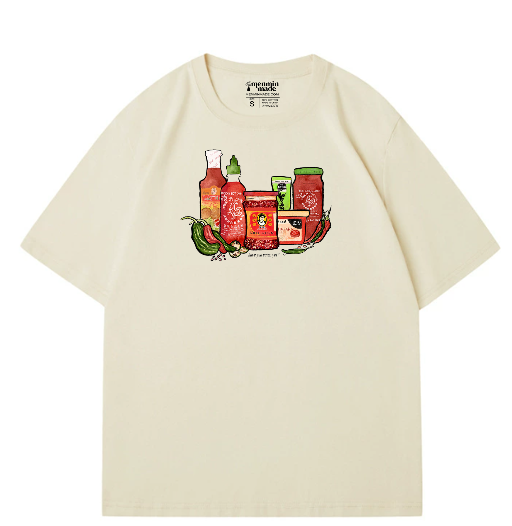 Every single food of mine needs some spice added to it. Inspired by my favorite aisle of the Asian grocery store, this Asian hot sauce tote bag is an homage to my favorite spices: Lao Gan Ma, sriracha, sweet Thai chili sauce, wasabi, gochujang, and garlic chili sauce. The t-shirt states, “Have You Eaten Yet?”