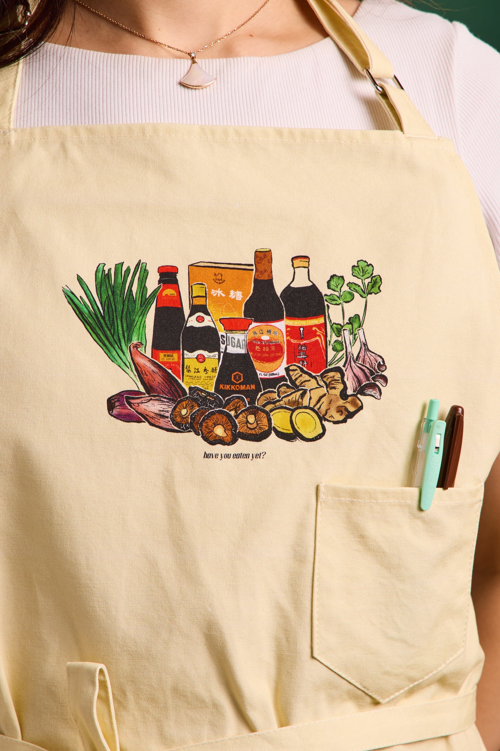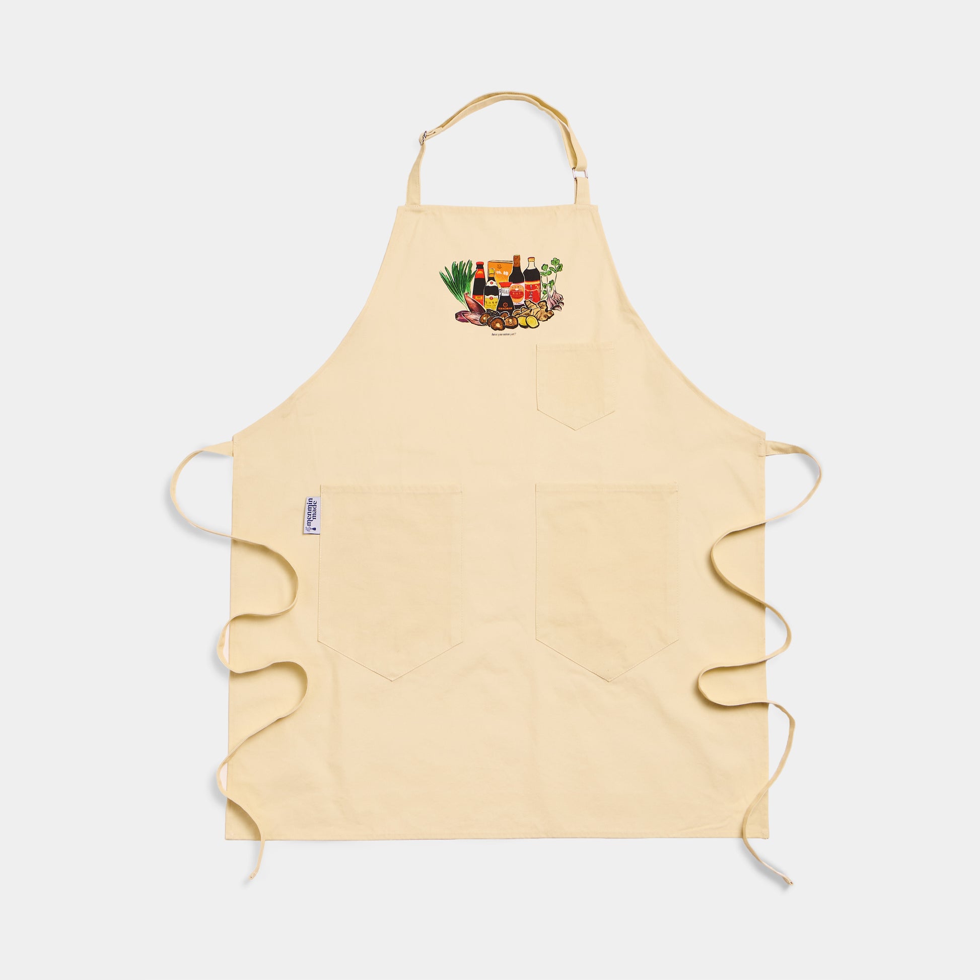 Inspired by Chinese cooking, I asked myself, "If my mom came over to my house, what would she need to make a really successful meal?" This Asian Sauces apron features the holy grails of Chinese sauces: light soy sauce, dark soy sauce, oyster sauce, Chinkiang vinegar, and Shaoxing wine. It also includes the main aromatics of Chinese cuisine: ginger, green onions, garlic, and shiitake mushrooms. For me, this print evokes family, home, and hearth.
