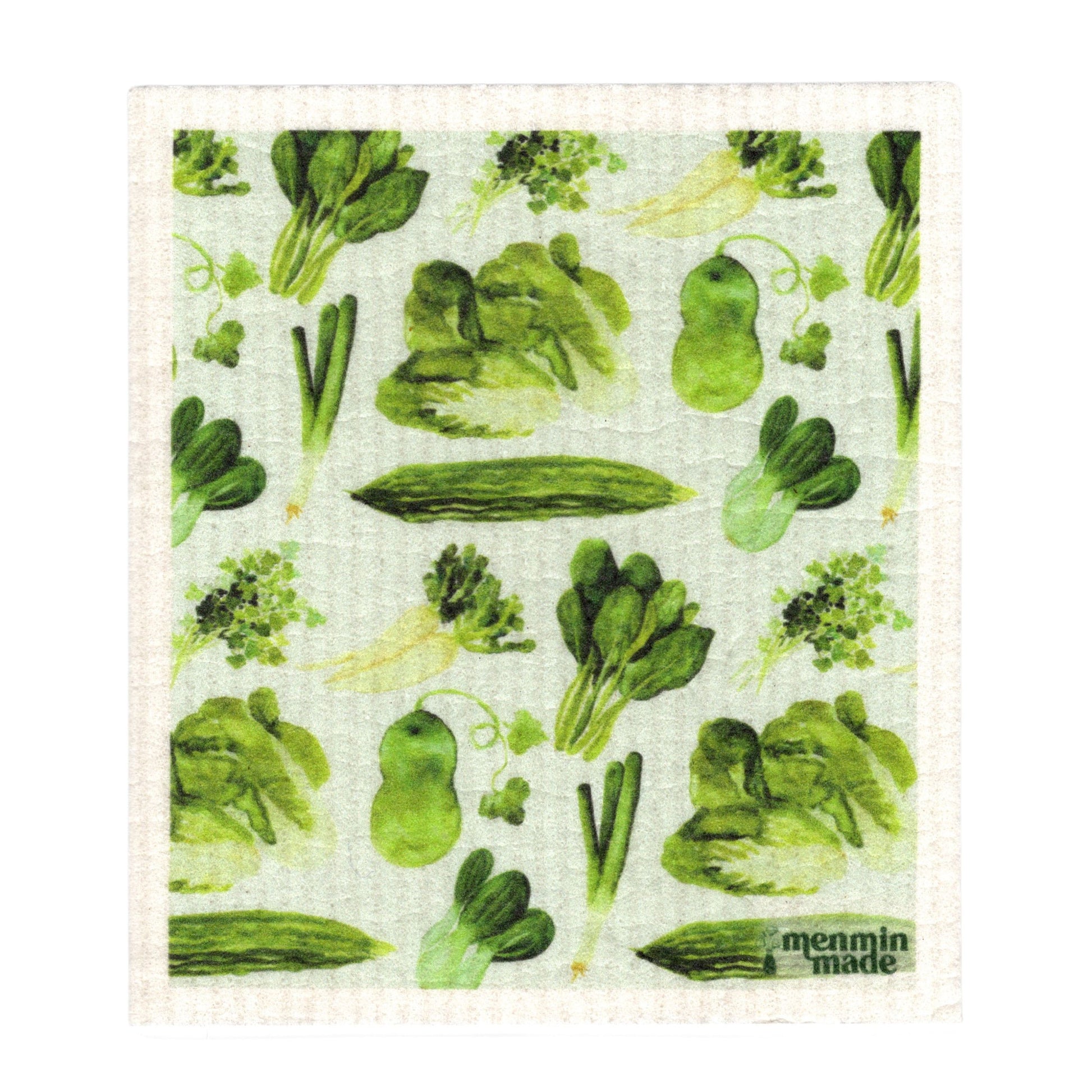 Experience the vibrant realm of Asian produce with our Asian Vegetable Swedish Dishcloth. This print features watercolor illustrations of yu choy, bok choy, bittermelon, daikon, winter melon, cilantro, and green onion.