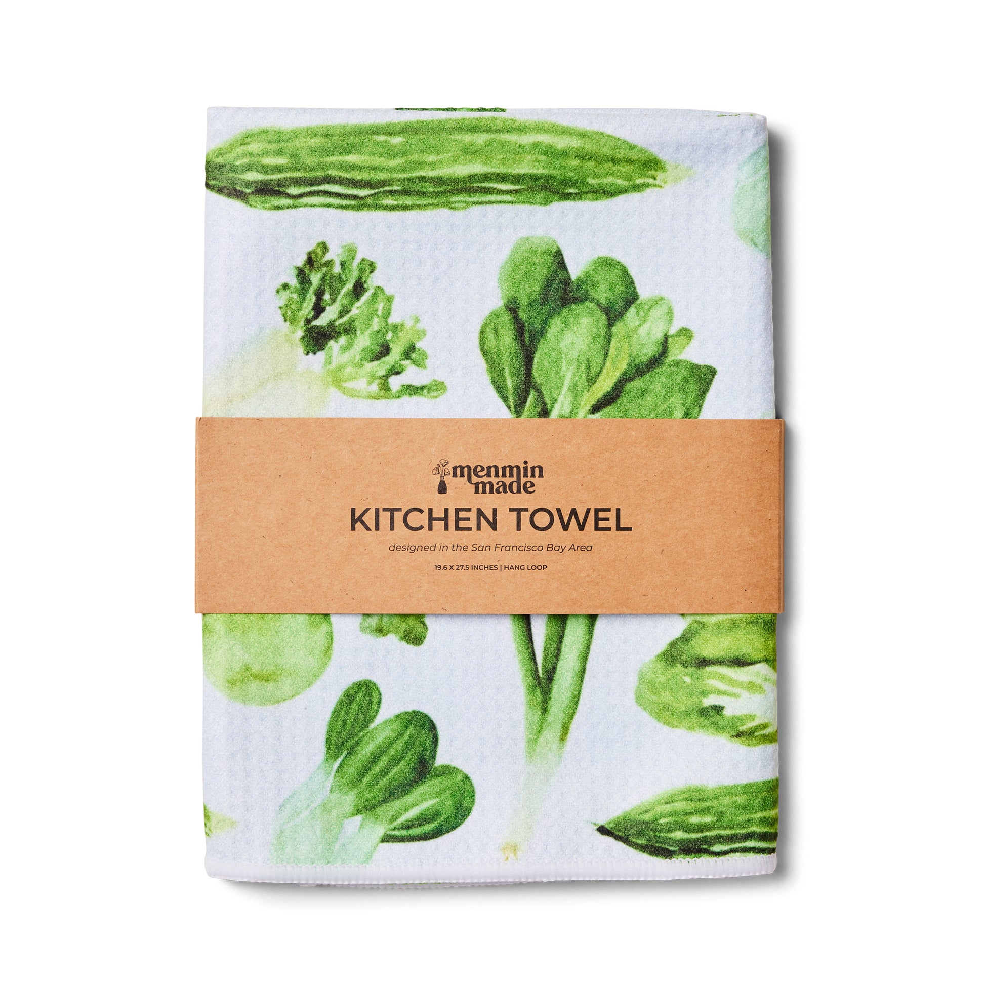 Experience the vibrant realm of Asian produce with our Asian Vegetable Kitchen Towel. This kitchen towel features watercolor illustrations of yu choy, bok choy, bittermelon, daikon, winter melon, cilantro, and green onion.